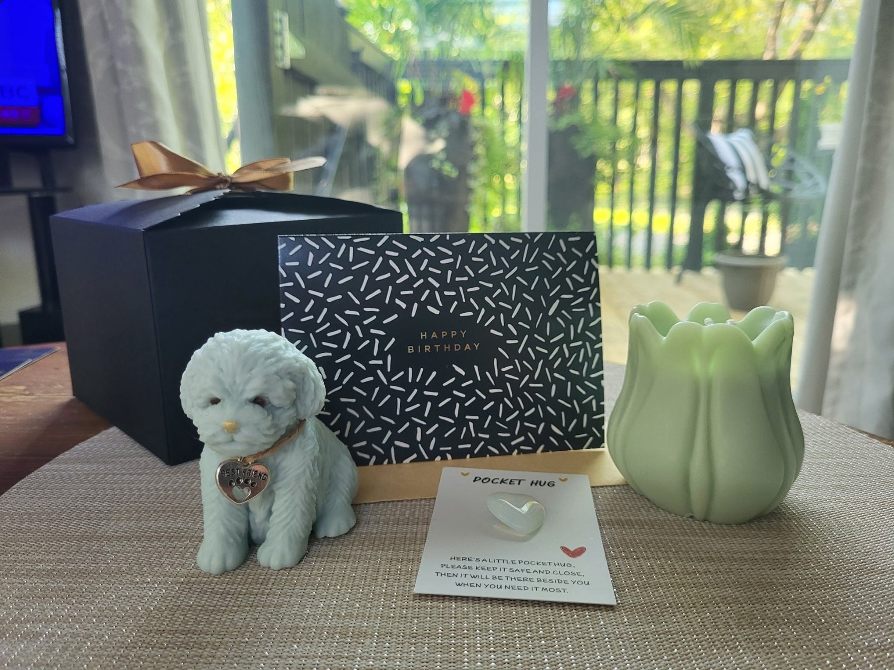 A heartfelt gift for every dog lover. This beautifully curated gift set is perfect for birthdays, thank you moments, or simply to celebrate the love between a pup and their person. It includes both a decorative keepsake and a scented candle, a pocket hug in every gift. Wrapped and ready to give.